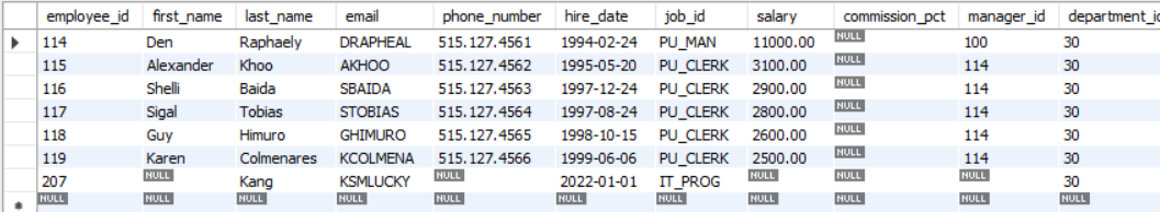 values (30, 300, 'Kang', 'email', current_date(), 'IT_PROG', 3000);