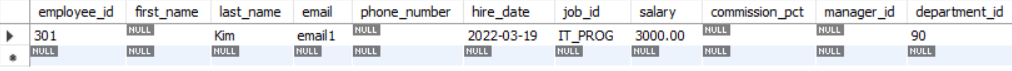 values (90, 301, 'Kim', 'email1', current_date(), 'IT_PROG', 3000);